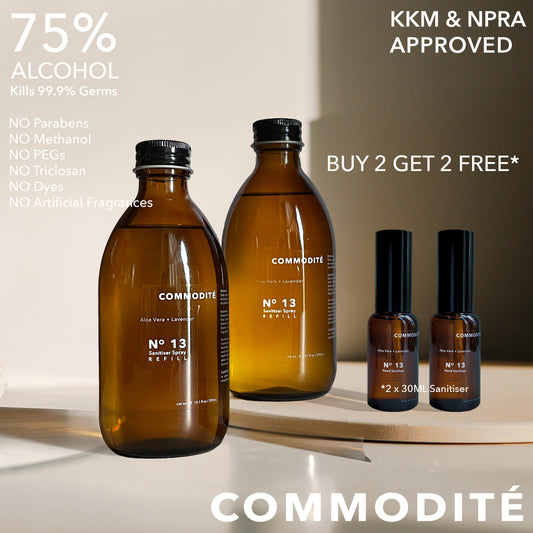 Commodité sanitizers kill 99.9% of germs with 75% ethyl alcohol, vegetable-derived glycerin, botanical extracts, and essential oils. Free of harsh chemicals, they're tough on germs yet gentle on skin, making them your essential hygiene choice.